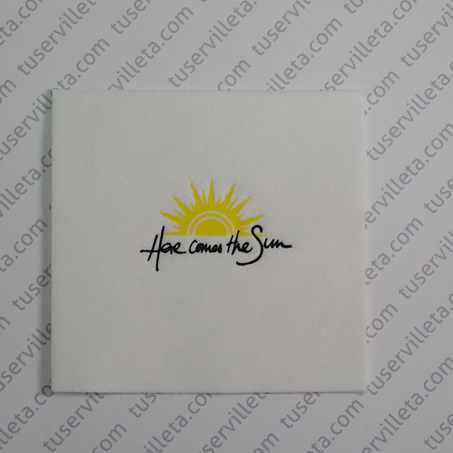 Servilletas Impresas Personalizadas Here comes the Sun se ha realizado en tamaño 20×20 cm. (10×10 cm. cerrada). Calidad Tisú Seco/Airlaid color Blanco con impresión a 2 tintas: Amarillo y Negro.
