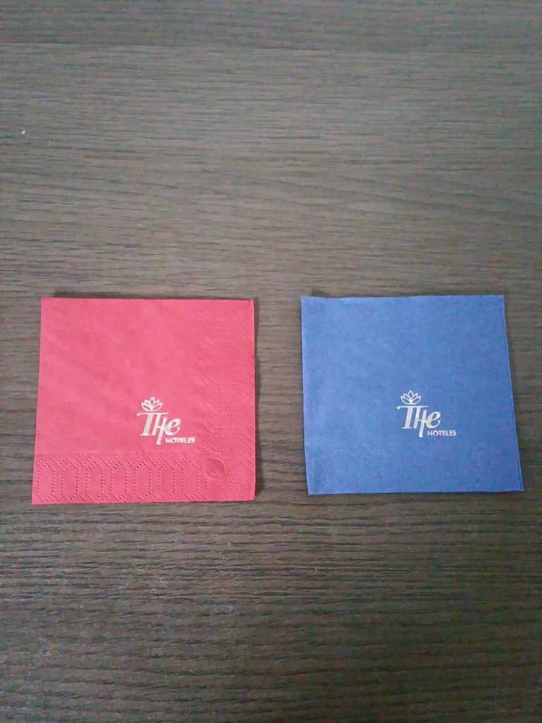 El trabajo de Servilletas Impresas Personalizadas The Hoteles se ha realizado en servilleta tamaño 20×20 cm. (tamaño abierta, 10x10cm. cerrada) calidad 2 capas, colores rojo y azul, impresión en tinta plata metalizada.