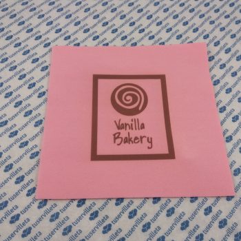 The work of custom printed napkins Vanilla Bakery has been made in size 33×33 cm. (16,5×16,5 cm. closed). Double point quality, color Pink and printed in Chocolate Brown. Size: 33×33 Quality: Double Point Color: Pink…