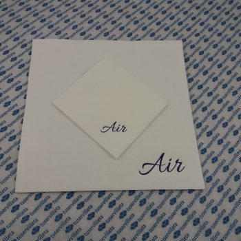 The work of custom printed napkins AIR has been made in size 20×20 and 40×40 cm. (10×10 and 20×20 cm. closed). Quality Double Point in white color and printed in Ocean Blue….