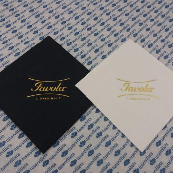 Printed napkins FAVOLA The work of custom printed napkins Favola has been made in size 24×24 cm. (12×12 cm. closed). 3 Layers quality, color White and Black and printed in Bright…